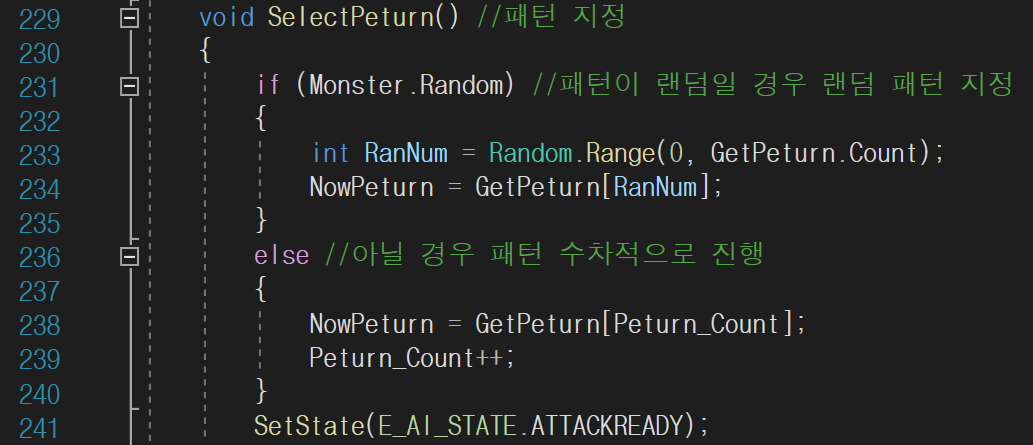 패턴 지정상태를 따로 만들어둔 이유는 패턴이 랜덤으로 지정 되는 몬스터와 순차적으로 진행되는 몬스터가