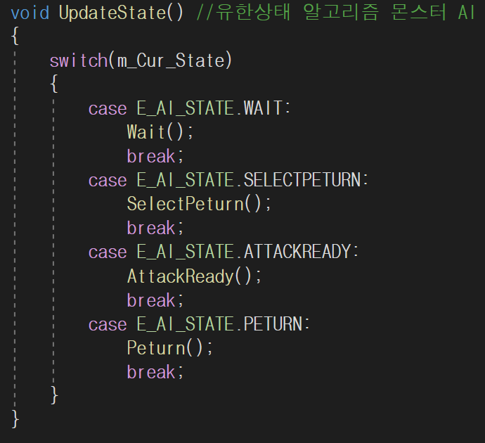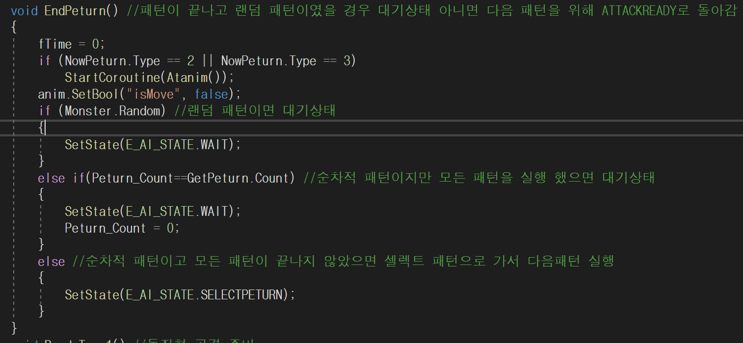 첫번째 if문은 몬스터가 랜덤이면 대기상태 두번째는 아까 보았던 패턴카운트와 갯패턴의 크기가 동일하면 대기상태로