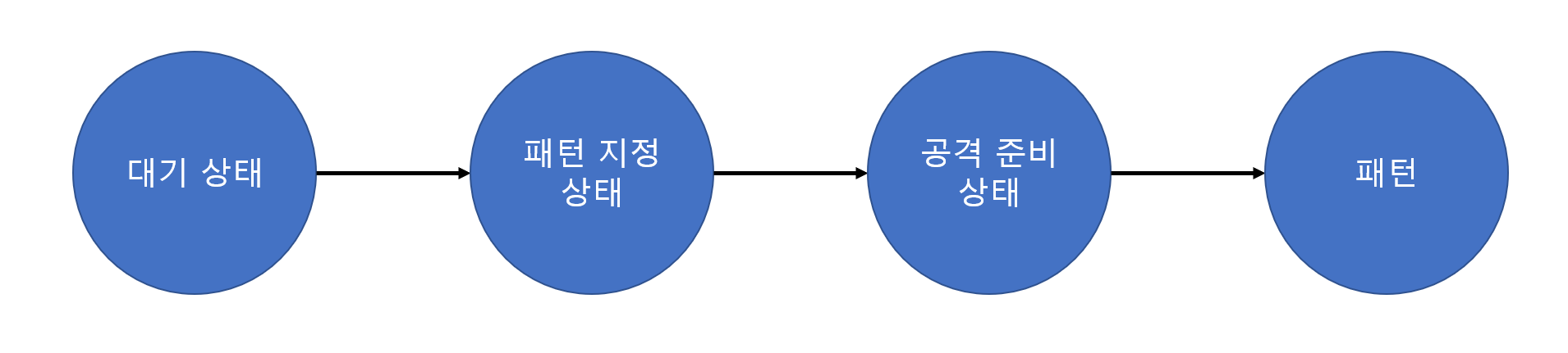 대기 상태에서 대기 쿨타임이 끝나면 패턴 지정 상태에서 패턴을 지정하고 공격준비 상태 - 패턴 상태가 된다.