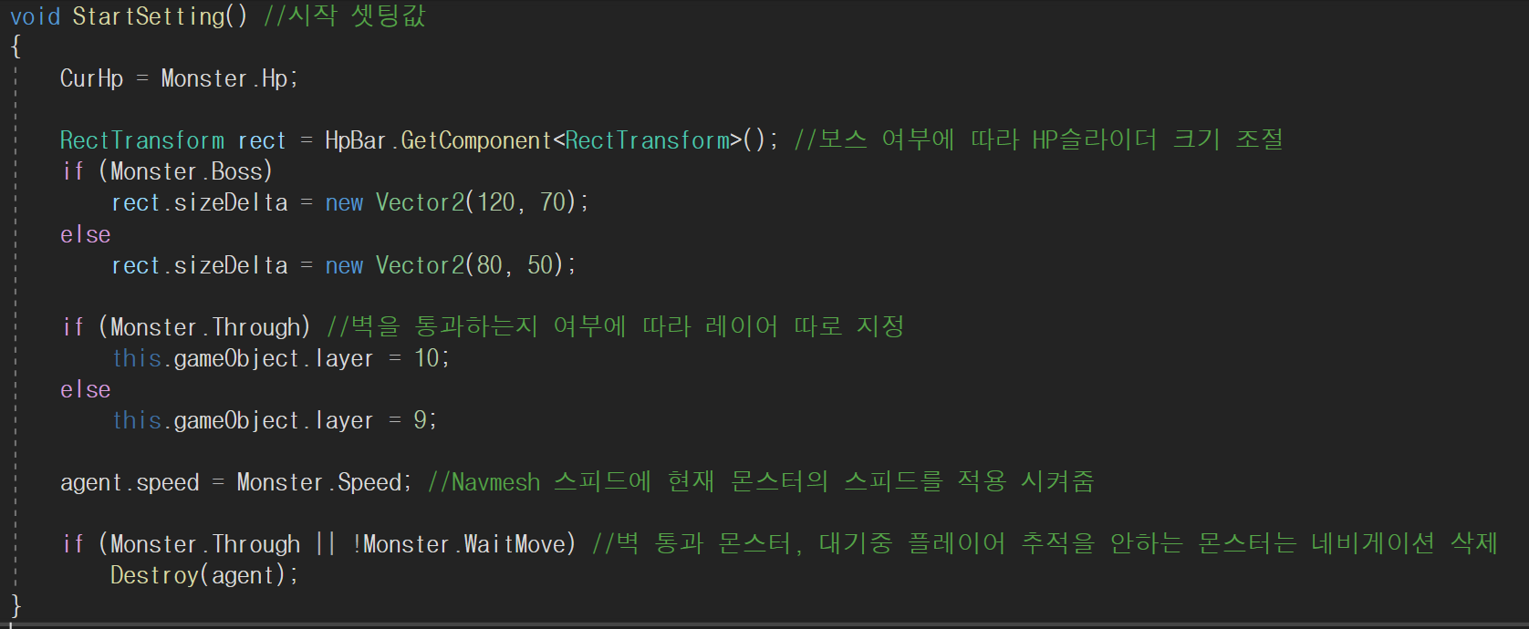 HpBar에서 RectTransform 컴포넌트를 불러와서 해당 몬스터가 보스이면 Hp바를 좀더 크게 만들어 주었다.