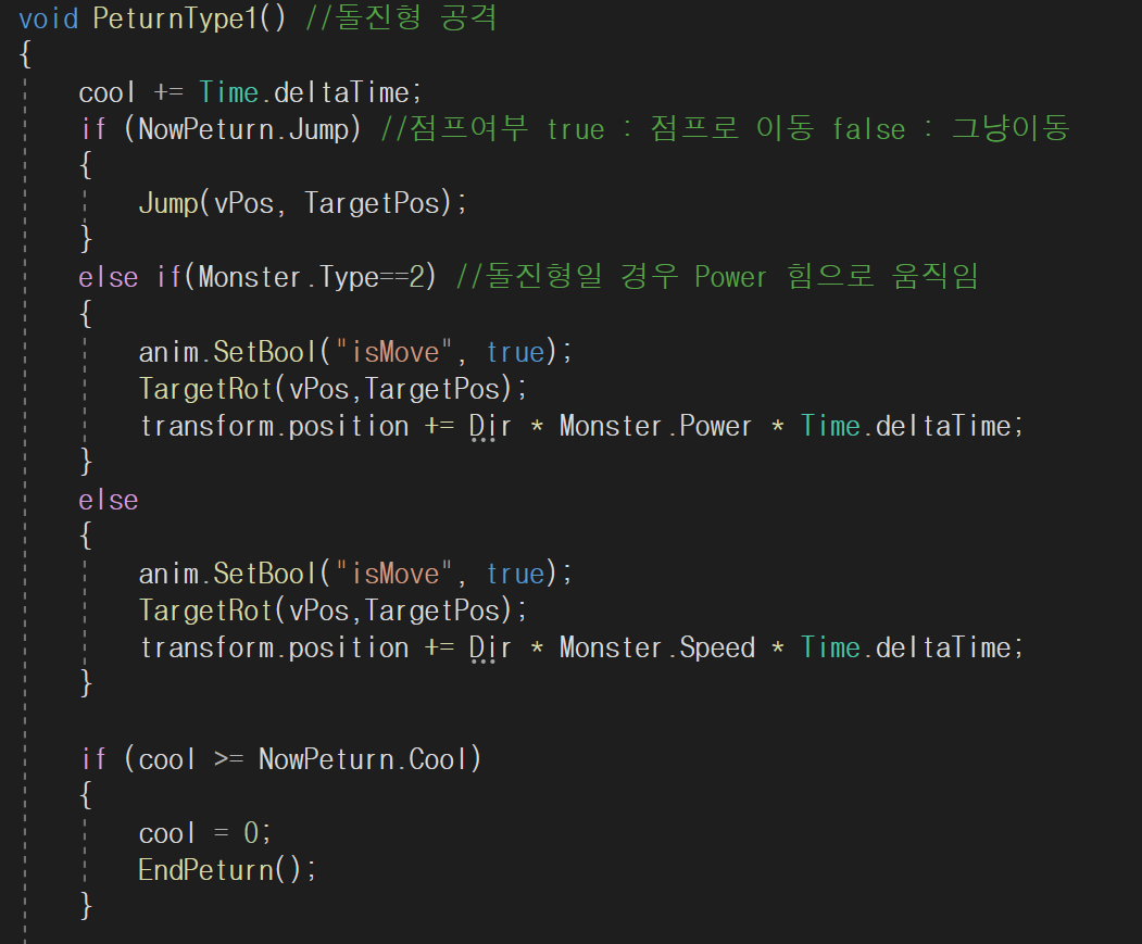 다음은 일반 돌진일 경우에서 몬스터 타입이 돌진형이면 Power로 돌진하게 하였고 원거리형 몬스터의 돌진은