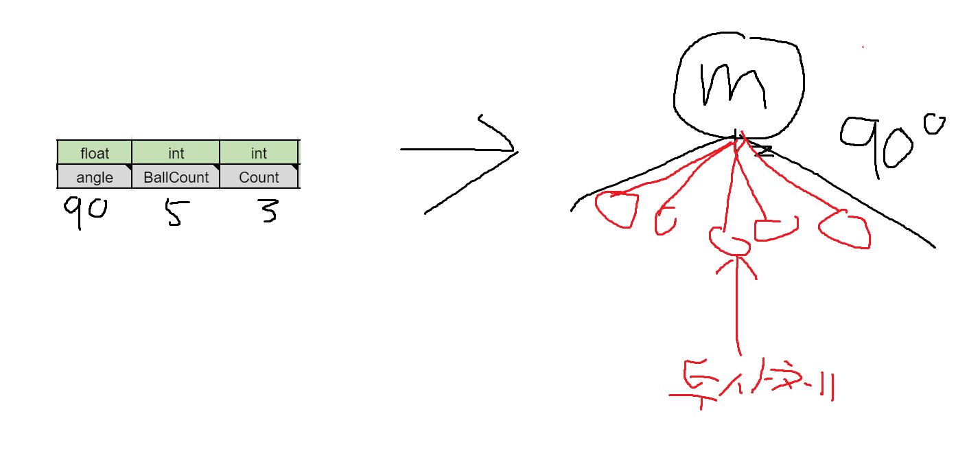 angle을 90, BallCount를 5, Count3으로 적었을 경우 그림처럼 몬스터의 앞으로 90도를 펼치는데 범위 지정법은