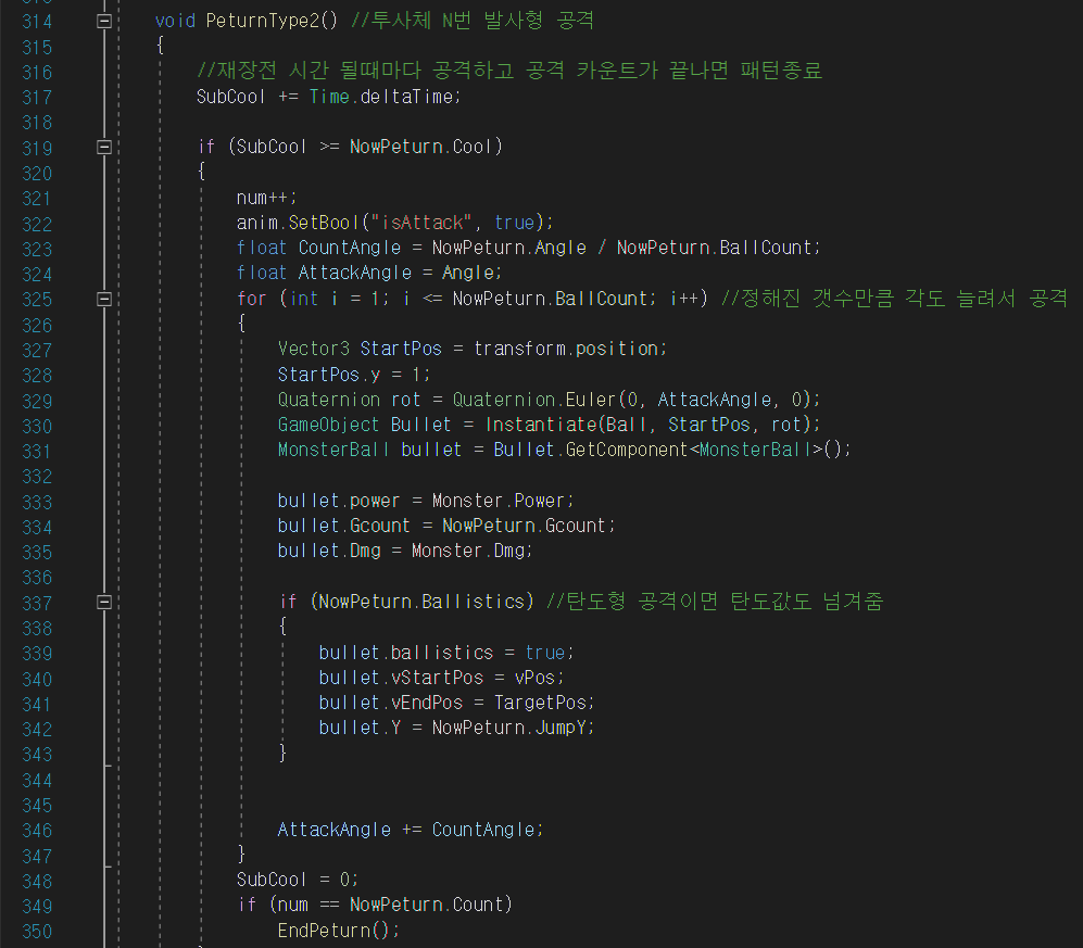 그래서 발사할 때마다 num을 증가시키고 349줄에서 num과 현재 패턴의 공격횟수가 같으면 패턴이 끝이 납니다.