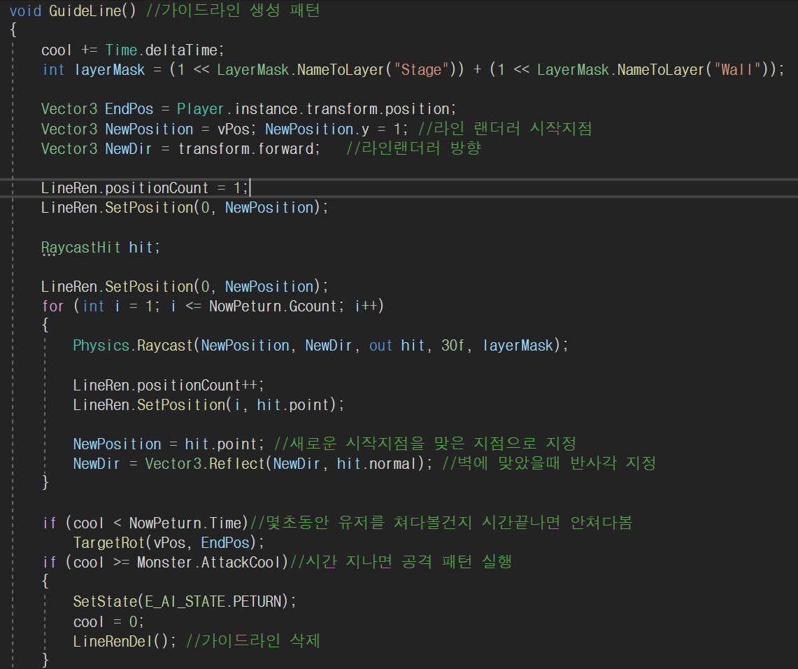 일단 쿨을 증가시키고 레이어를 지정하였습니다 레이어는 가이드라인이 반사각으로 여러번 반사될 경우 사용됩니다.