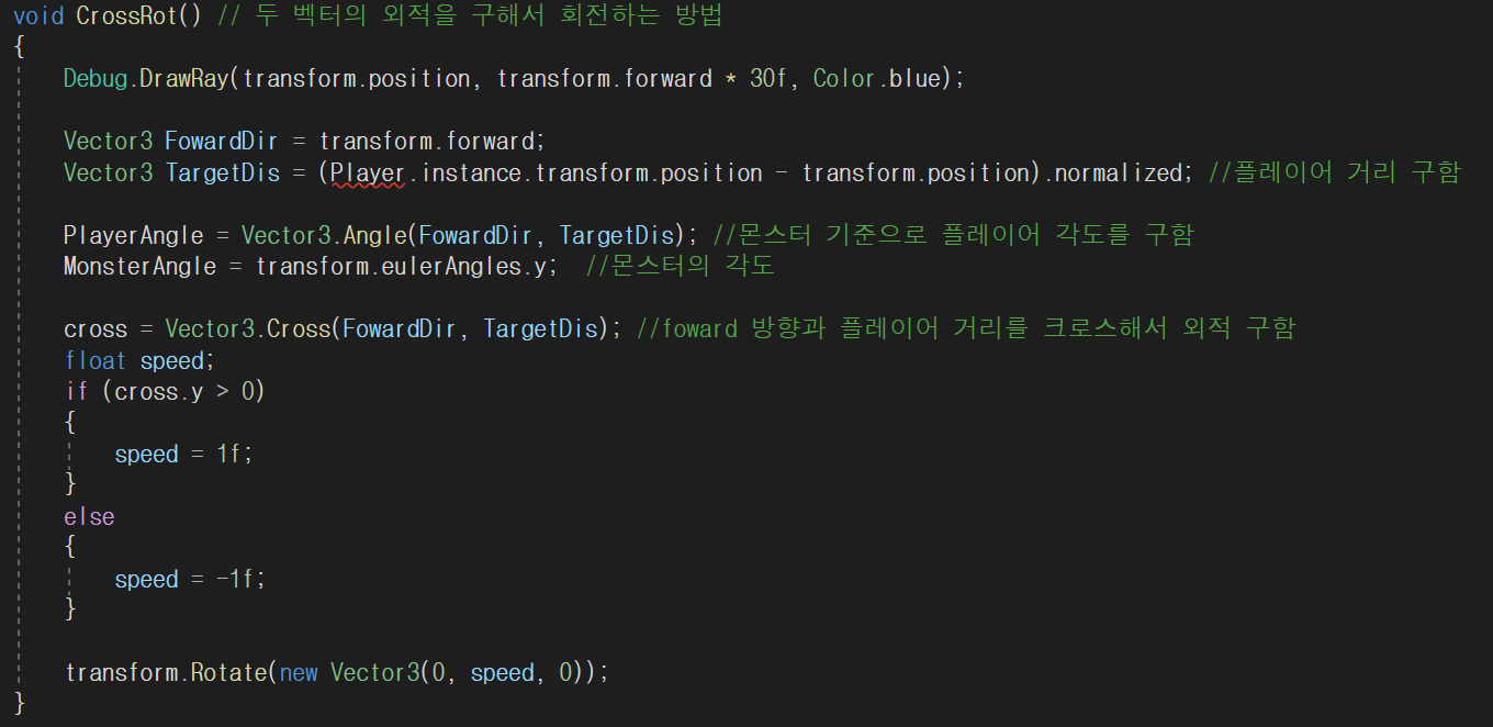 이방법은 RotateTowards를 몰랐을 때 사용한 방법으로 cross를 이용하여 현재 바라보는 각도, 목표 각도를 크로스하여
