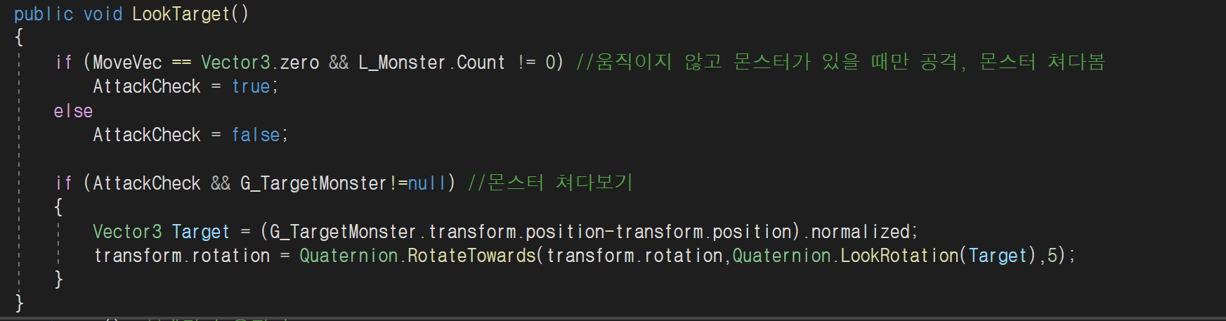 타겟 몬스터가 null값이 아니라면 타겟 몬스터르의 방향으로 쳐다보게 하였다. 이때 천천히 쳐다보게하려면