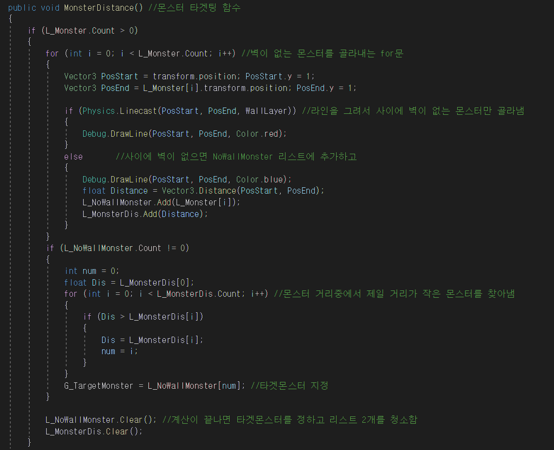 일단 float Dis변수에 첫번째 몬스터와의 거리를 넣고 모든 몬스터의 거리를 비교후 더 작은 거리가 있다면